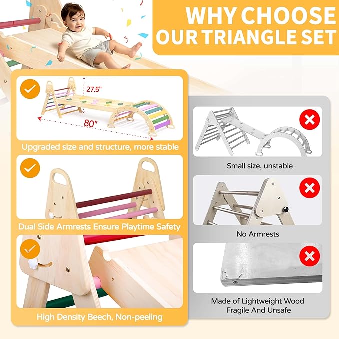 - 2024 New Upgrade: The arched ladder of the pikler triangle set has a unique design. Each part can be used individually or combined in various ways, providing more gameplay options. Specially designed for babies' indoor adventures, it is the perfect choice for enhancing physical coordination, balance, and creative play.