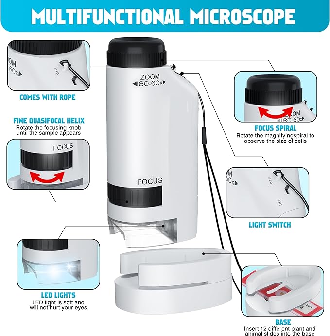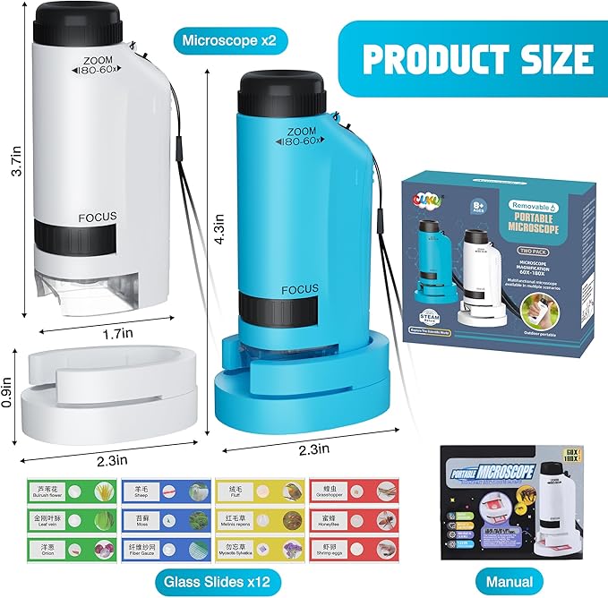 - Portable Microscope for Kids:Microscope toys for little scientists, zoom 60x-180x, the set comes with 12 different plants and animals slides, by adjusting zoom and focus can observe a different micro world, our microscope is lightweight and portable, can be easily tucked into the pocket,your kid can observe the world at any time and anywhere with this little microscope, stimulate children's interest in science.