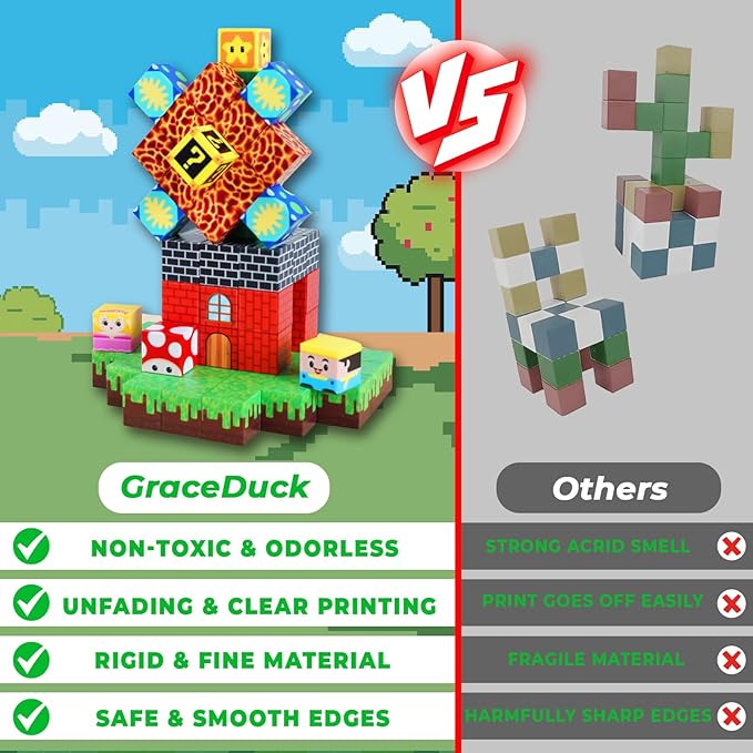 - 【Adventure Game Castle Magnetic Cube Kit】Including 150 magnetic cubes in 25 colors. Idea booklet with the storyline and beautiful patterns, keep them busy in clever ways. GraceDuck magnetic activity cubes are made of high-quality ABS material and crafted with the round edges. Unlike other magnetic toys on the market, our magnetic cubes kit with super strong internal magnetic, which is easier for toddlers ages 3+ to stick the cubes together and make builds sturdy. Perfect STEM toys help kids gain a deeper understanding of the structure and learn about magnetic properties!