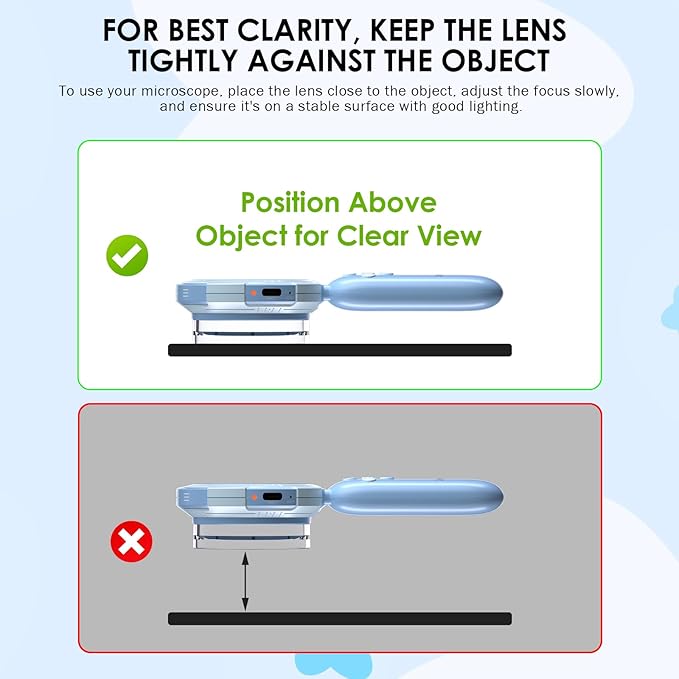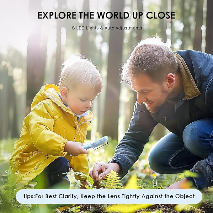 - Child-Friendly Operation: Simple 100X zoom and manual focus controls designed for small hands. Built-in 8 LED lights with auto brightness adjustment ensure clear viewing in any setting. Perfect for indoor and outdoor exploration with instant, high-quality results.