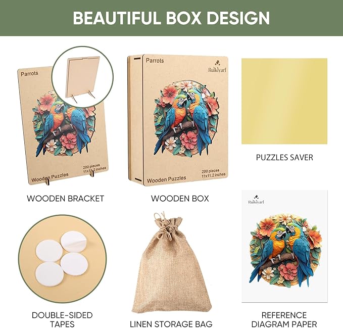 Ruikiyart Wooden Puzzles for Adults, 5MM 200 Pieces Parrots Wooden Jigsaw Puzzles, Birds Unique Shaped Puzzle Gifts for Adults and Kids on Thanksgiving, Challenging Family Puzzle Games (11"*11.2")
