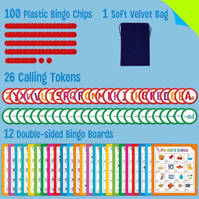 - Super Value Pack: The bingo game set comes with 12 double-sided bingo boards (one side is letters bingo, another side is phonics words bingo), 26 double-sided calling tokens, 100 plastic bingo chips and 1 storage bag. It could meet the needs of your activity of up to 12 players, perfect for diverse events. An attached soft velvet bag to keep a tidy and neat storage and organization.