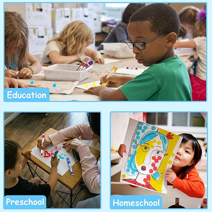 - 【MESS-FREE AND WASHABLE】The water-based formula also makes these toddler markers easy to wash off hands, clothes, and surfaces, ensuring quick clean-up and worry-free crafting sessions without the stress of permanent stains. Whether it's for home or classroom art projects, these dot paints are an essential tool for toddlers' arts and crafts. The dot design allows for controlled painting and prevents color bleeding.