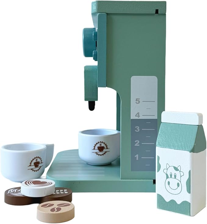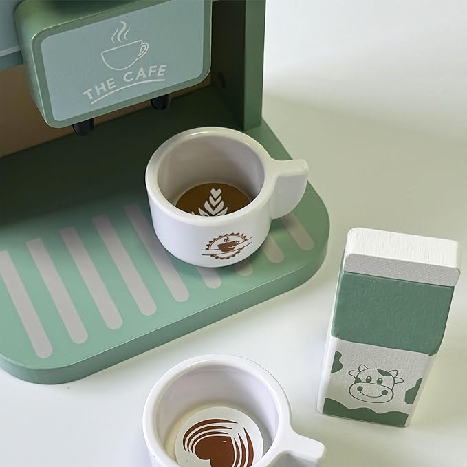 - Complete All-in-One Play Set: Everything needed for imaginative café adventures: It includes 8 premium wooden pieces—such as a coffee maker, milk carton, 2 cups, and 4 coffee pods—ideal for wooden kitchen toys enthusiasts. The wooden play kitchen accessories store neatly inside the coffee maker for easy cleanup.