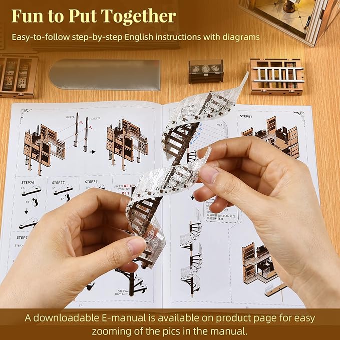 - [Bring Fun to Life] The diy book nook kit combines fun and relaxation. During the 6-10 hours of enjoyable assembly time, you can improve your dexterity and patience with this miniature dollhouse booknooks.Additionally, the downloadable E-manual can be zoomed to help identify parts orientation more clearly