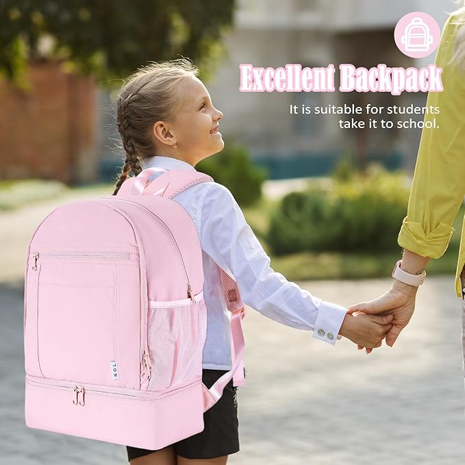 NOL Natural Organic Lifestyle Kids 2-in-1 Backpack & Insulated Lunch Bag - 16" Multi-Functional Large Compartments Backpack for School & Travel, Double Deck, Water Resistant, Leak-proof, Padded (Pink)