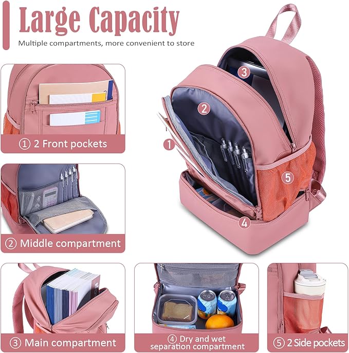 - Multiple Organized Pockets:The whole lunch backpack size: 16.5" H x 11" L x 7.5" W.The kid's backpack features 1 laptop sleeve compartment for 16"laptops or books,1 main zipper pocket for books, clothes, files etc.The second and third zipper pocket for your daily necessities,notebooks, pens.1 open pocket for tissues, keys.2 side pockets for umbrella or water-bottle.The bottom is also a leak-proof insulated lunch bag.Large capacity kids 2-in-1 Backpack & Insulated Lunch Bag is perfect for school.