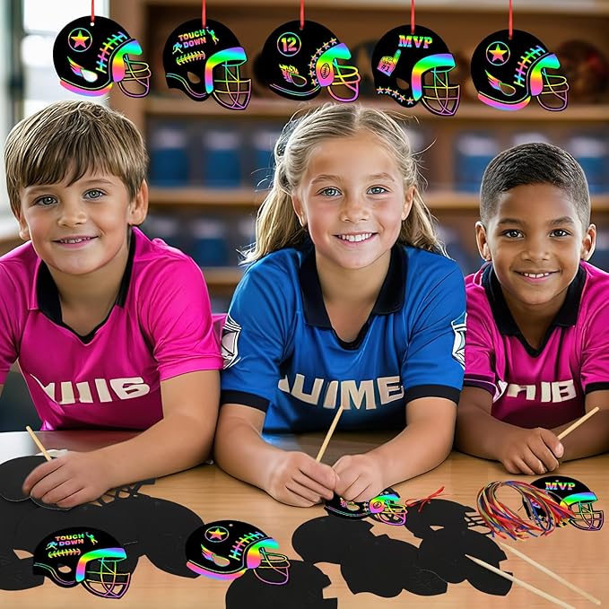 JULMELON 36 PCS Football Crafts for Kids, Rainbow Scratch Paper Art for Kids Football Party Favors Helmet Scratch Off Cards for Birthday Party Supplies School Activities