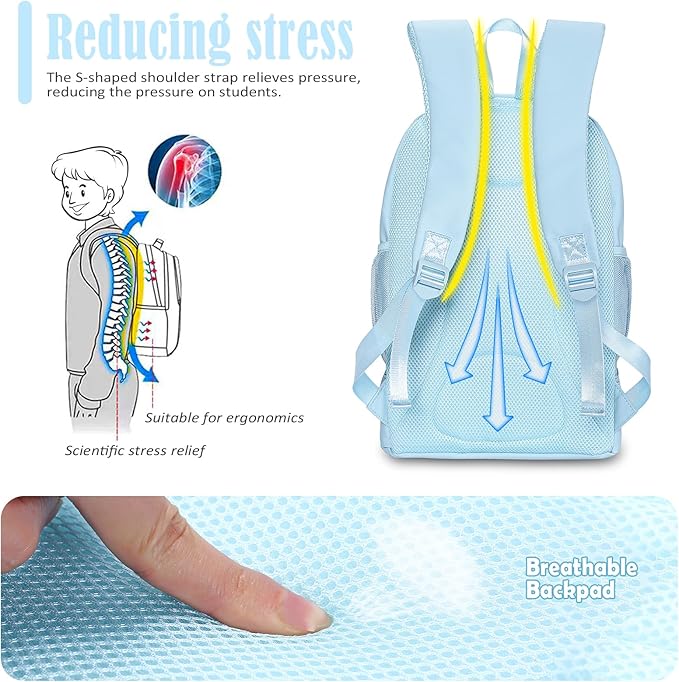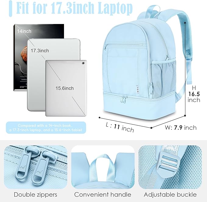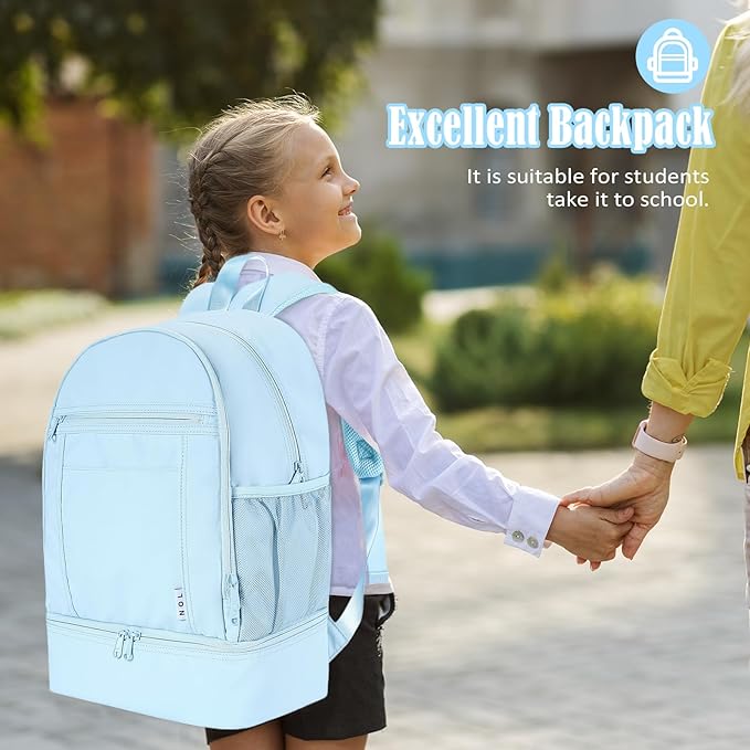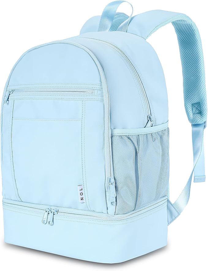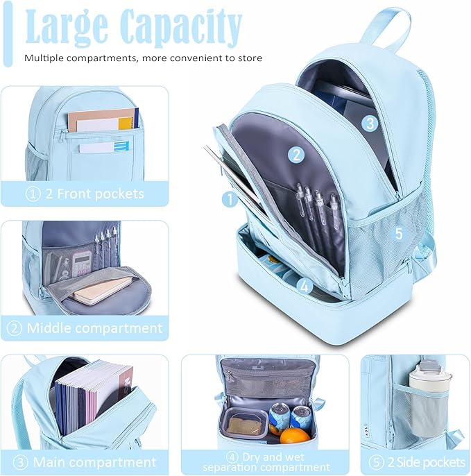 NOL Natural Organic Lifestyle Kids 2-in-1 Backpack & Insulated Lunch Bag-16 Multi-Functional Large Compartments Backpack for School & Travel, Double Deck, Water Resistant,Leak-Proof,Padded-Light Blue