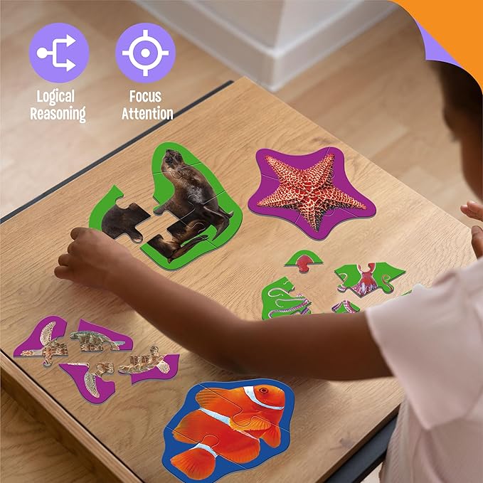 - Value Pack: 12 marine animal puzzles in a portable plastic box, easy to storage and stay organized. Each puzzle features beautifully detailed illustrations of various sea animals, allowing children to learn about different species while having fun. Animals includes seahorse, jellyfish, octopus, shark, dolphin, etc.