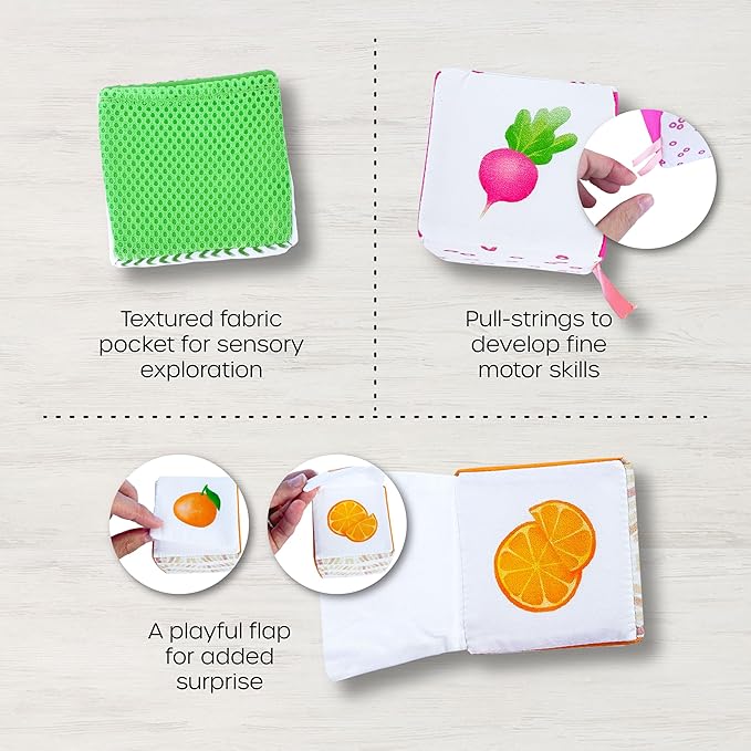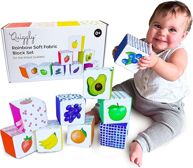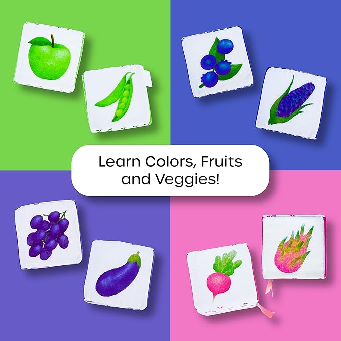 - Vibrant Rainbow Colors: Each of the 8 soft fabric blocks features a different color of the rainbow—red, orange, yellow, green, blue, purple, and pink—perfect for teaching babies about colors through play. The blocks also feature beautiful watercolor prints of fruits and vegetables, engaging your little one in early learning.