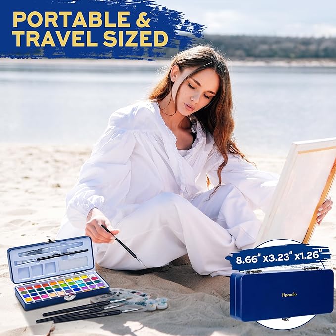 - Portable Watercolor Paint Box: 50-color watercolor paint set comes in a durable metal case (20.8x12.5x3.5cm), lightweight and leak-proof for easy portability. Sturdy construction ensures full protection, making it ideal for outdoor sketching, travel inspiration, or daily creative sessions—ready to capture ideas anytime, anywhere.