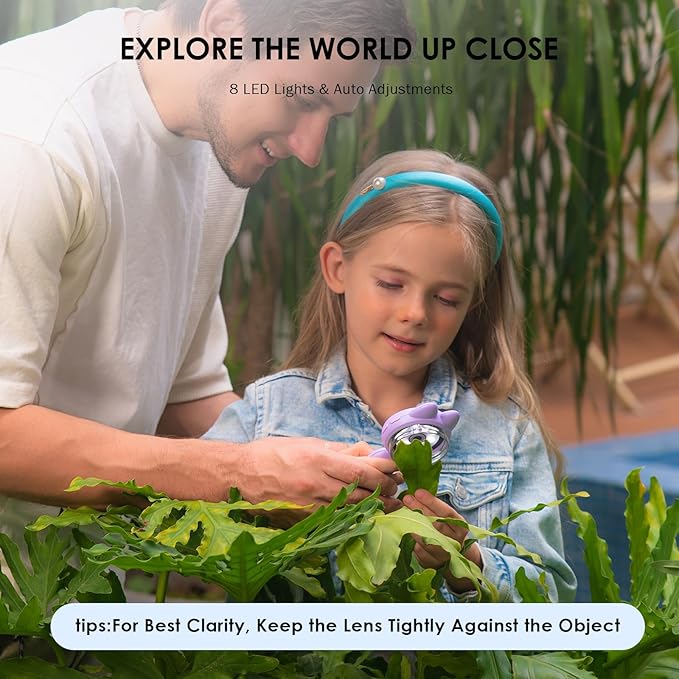 - Child-Friendly Operation: Simple 100X zoom and manual focus controls designed for small hands. Built-in 8 LED lights with auto brightness adjustment ensure clear viewing in any setting. Perfect for indoor and outdoor exploration with instant, high-quality results.
