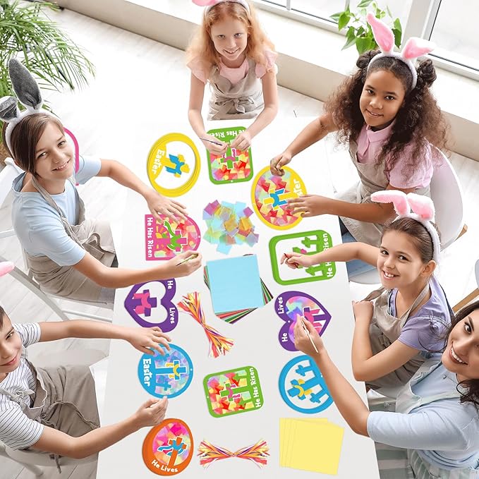 - Package includes: You will get 36 pieces of Easter themed templates(5.9 x 5.1inches), 200pcs tissue papers in 10 assorted colors, 40 transparent PVC sticker, 40 ribbons in 6 colors. With everything included, this Christian Easter cross sun catcher craft kit provides the great balance of creativity and convenience, making it ideal for a fun, engaging crafting experience.