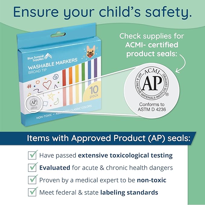 - Safe and Non-Toxic for All Ages – Certified with the ACMI Approved Product (AP) seal, these non-toxic broad tip markers are safe for kids of all ages and tested by medical experts to meet U.S. art material safety standards.