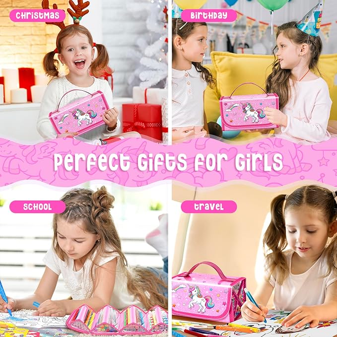 - High Quality Art Supplies: Safe art kits to use for any level of artist. The compact, tidy and portable unicorn case contains four zippered compartments, making it easy for your little girl to keep her pens organized. Keep your little art enthusiast happy and busy. It's perfect girl toy and gift for birthdays, holidays, Christmas, Valentines, Easter and any other special occasion.