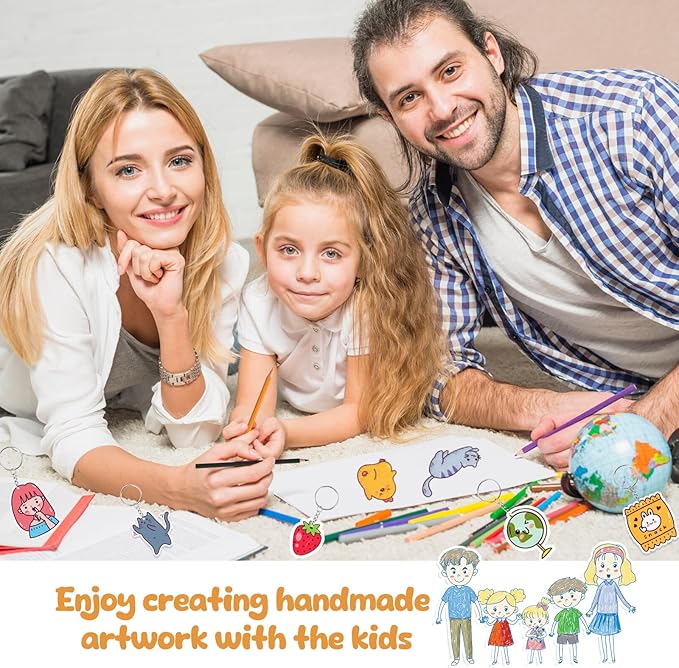 - SIMPLE TO USE:Just draw your art, cut it out with scissors and it will shrink in your oven,thicker form that maintains its initial color and shape. The key chain and open iron ring are sturdy and durable, ensuring that your masterpiece will last
