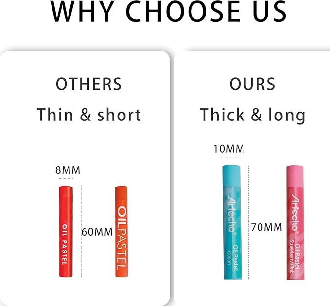 - Perfect Packaging: Humanized size design, can be easily put into all kinds of bags. Each oil pastel (70 mm × Ø 10mm) has its own independent paper sleeve, not easy to fall off and break