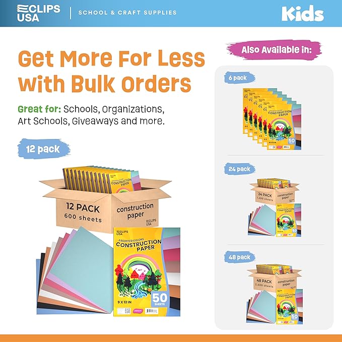 Construction Paper Bulk (600 Sheets) 9 x 12 Construction Paper for Kids, Color Art Paper, Assorted Colors, 50 Sheets Per Pack, (12 Pack)