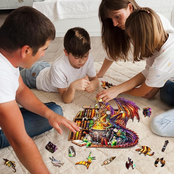- Dragon Magic Potion Wooden Puzzle: This wooden jigsaw puzzle takes inspiration from nature, featuring irregularly shaped animal pieces. The original hand-drawn designs not only provide a puzzle-solving experience but also serve as unique home décor