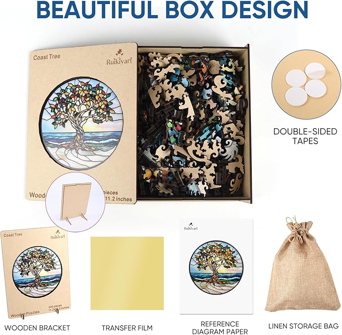 Ruikiyart Wooden Puzzles for Adults, 5MM 200 Pieces Coast Tree Wooden Jigsaw Puzzles, Tree of Life Puzzle Unique Shaped for Adults and Kids on Birthday, Christmas Family Puzzle Games (11.2"*11.2")