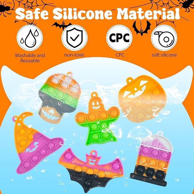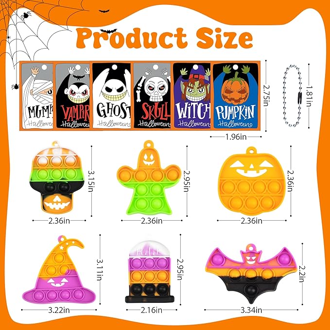 - 【HALLOWEEN PARTY FAVORS】Get 6 Halloween pop toy styles: Witch Hats, Bats, Pumpkins, Ghosts, and Skeletons! Each style includes 4 pcs (24 pcs total), plus 24 Halloween-themed DIY cards and 24 chain links. Personalize the fun—write spooky blessings or messages for kids, students, or friends on the back of each card