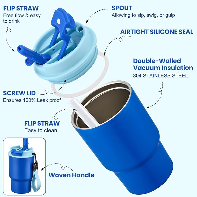 - 14oz Dual Drinking Spout Kids Insulated Water Bottle: This toddler water bottle is double vacuum insulated to keep drinks warm for up to 8 hours. The sealing technology in the lid ensures that each insulated water bottle is 100% leak and spill proof. Sweat-proof kids' water bottles come with a braided rope carry handle to take kids' drinks on the go and keep them hydrated. The dual spout and straw design makes it easy for kids to drink in different scenarios.