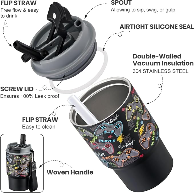 - 14oz Dual Drinking Spout Kids Insulated Water Bottle: This toddler water bottle is double vacuum insulated to keep drinks warm for up to 8 hours. The sealing technology in the lid ensures that each insulated water bottle is 100% leak and spill proof. Sweat-proof kids' water bottles come with a braided rope carry handle to take kids' drinks on the go and keep them hydrated. The dual spout and straw design makes it easy for kids to drink in different scenarios.