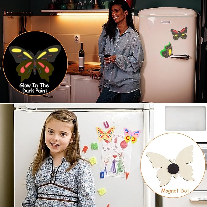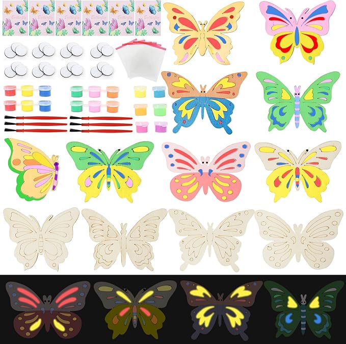 - Package Includs: The butterflies wooden craft kit includes everything needed for an enjoyable crafting experience! 24 space cards, 24 unique wooden signs (8 styles), 72 vibrant paints, 24 glow in the dark paints, 24 painting brushes, 24 magnet and 24 clear bags, ideal for children who love arts and crafts.