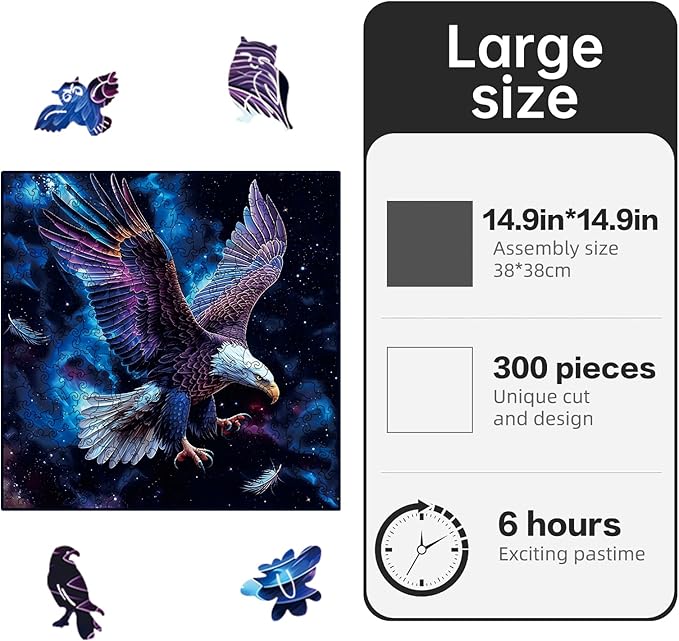 - Exceptional Quality & Eco-Friendly Materials:Crafted from premium eco-friendly wood, this wooden eagle puzzle promises durability and an eco-conscious experience. Each of the 300 pieces is precision-cut to ensure a flawless fit, providing a smooth, frustration-free puzzle-solving experience. The thick and sturdy pieces are built to last, offering endless hours of enjoyment and making this puzzle a long-lasting addition to your collection.