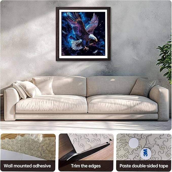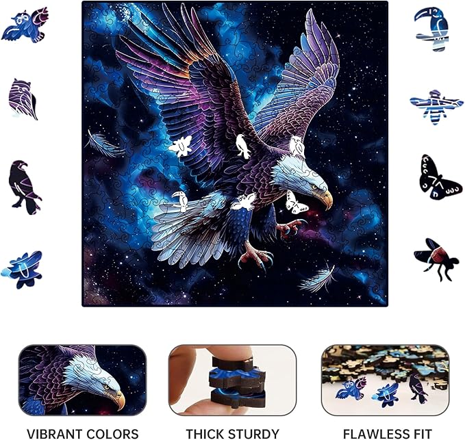 - Vibrant & Intricate Eagle Design:Step into a world of color and beauty with this wooden puzzle art. The majestic eagle soaring through a cosmic sky, surrounded by swirling clouds and feathers, is depicted in vibrant colors that capture the bird’s powerful wings and piercing gaze. This stunning design transforms the puzzle into a breathtaking work of art that will captivate you from the first piece to the last.