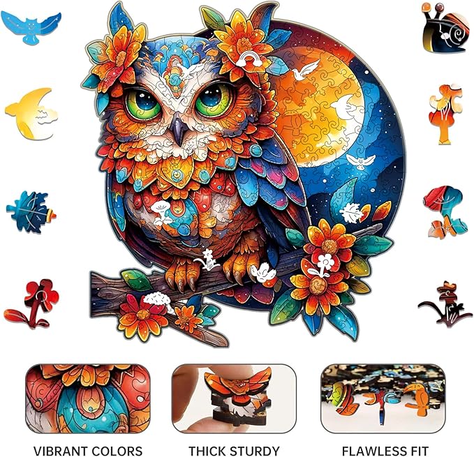 - Stunning Artistic Design:This puzzle features a vibrant, eye-catching wooden puzzle art design of an owl surrounded by colorful flowers and a serene moonlit backdrop. The intricate details and brilliant colors make this puzzle more than just a game – it’s a beautiful work of art that will captivate you from the first piece to the last.