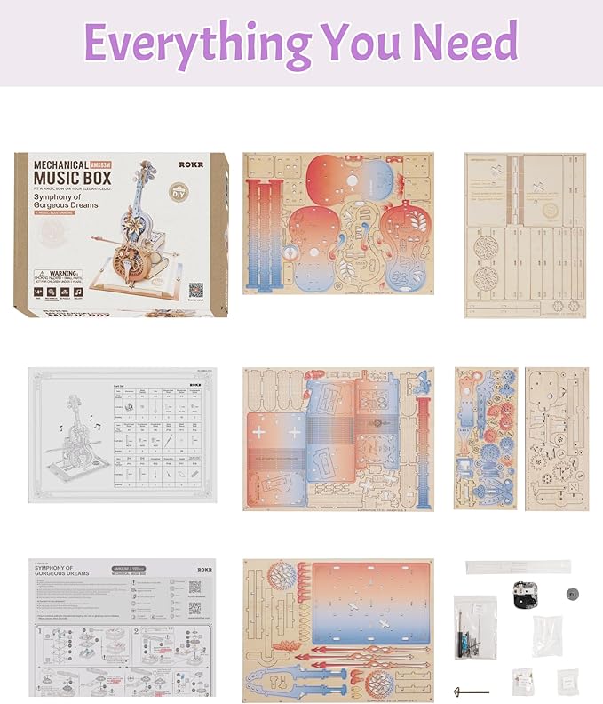 - [ROKR 3D Puzzle] Elevate your space with the ROKR 3D Wooden Cello Model, now with vivid orange-blue gradient UV-coated details that shimmer in the light. Playing "The Blue Danube" through its mechanical music box highlights a classical instrument's elegance.