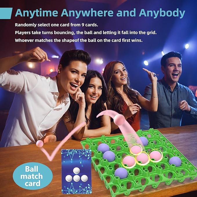 - · Hilarious Game Rules: Draw a challenge card, take your bounce shot, and whoever matches the pattern first is the winner! The included rule suggestions turn every round into a riot of laughter and friendly rivalry. It’s the perfect alternative to pong!