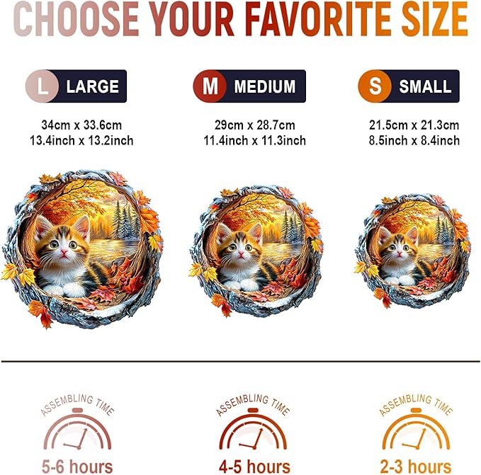 - Kitten in Autumn Wooden Puzzle: This wooden puzzle takes inspiration from nature, intended to display different landscapes of 3D effect with flat puzzle. The original hand-drawn designs not only provide a puzzle-solving experience but also serve as unique home décor