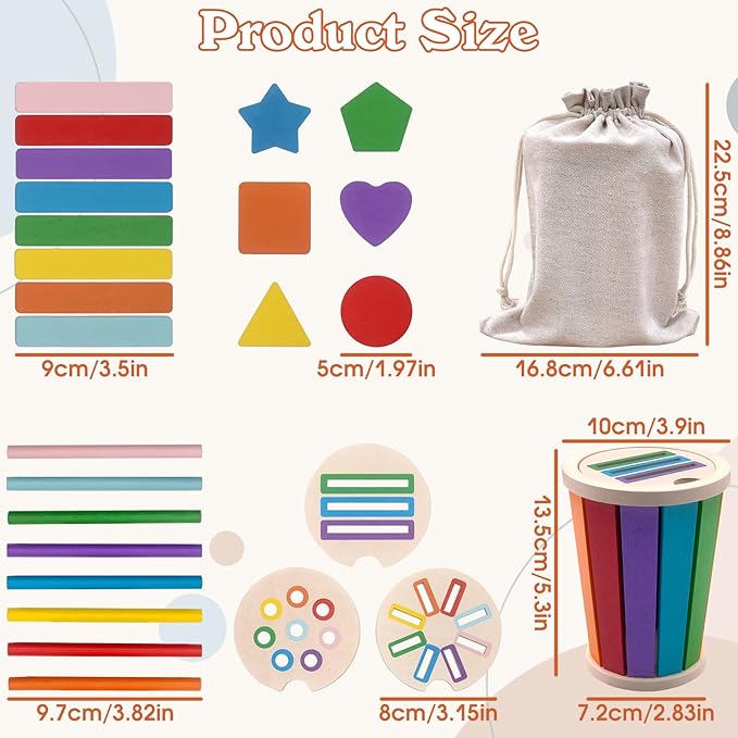 - 3-in-1 Montessori Toys for Early Learning: This colorful wooden toy set includes sticks, chips, and shapes for color sorting, shape recognition, and matching games. Perfect for developing hand-eye coordination, fine motor skills, and problem-solving abilities in young children.