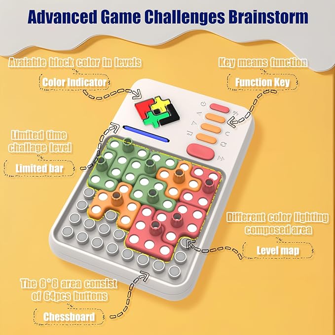 - Ultimate Brain Teaser for Kids: The gameplay of this electronic puzzle game is to place appropriate colored pieces to cover the illuminated area, and the indicator on the left determines which color you should use in each challenge. The challenge and excitement of the game will keep children engaged and entertained