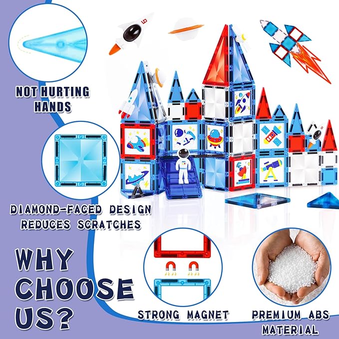 - 【58 Pcs Creative Space-loving Gift Ideas】 A diverse pack of magnetic tiles encourages creative imagination about a magical universe. This space playset comes with 39 pcs of diamond magnetic tiles in different shapes and sizes, an idea booklet, a storage bag, 5 magnetic figures of space theme, 8 interesting DIY window arts, and 6 paint gel tubes. Get ready for your space adventure!