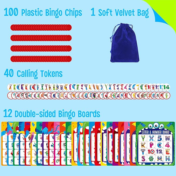- Double-sided Design: The bingo board features double-sided printing; one side shows adorable monsters, and the other side shows bold uppercase letters and numbers 1-14. This unique design allows for versatile gameplay, making it perfect for different learning experiences. Kids can enjoy endless hours of fun while developing essential skills in an entertaining way!