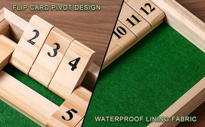 - ✅【What material is used】Shut the box game is made of exquisite natural hardwood with a green soft felt surface, which is safe, sturdy, and has a good texture. The size of this four-way board game is 8.66 x 8.66 inches. Each player has 10 chess pieces with numbers from 1 to 10. Bring 810 dice. If you have any questions, please feel free to contact us at any time. We are very willing to provide assistance to you.