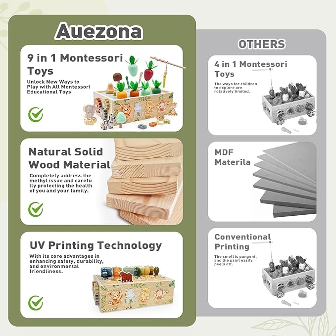 - 【Eco-Friendly Montessori Wooden Toys】Unlike the common MDF wood toys on the market, Auezona insists on using natural solid wood–Premium montessori toys for 1+ year old with child-safe UV-cured paint (exceeds EU/US standards). Eco-conscious craftsmanship ensures lasting safety montessori toys for 2 year old. Durable design withstands toddler play while protecting your child’s health.