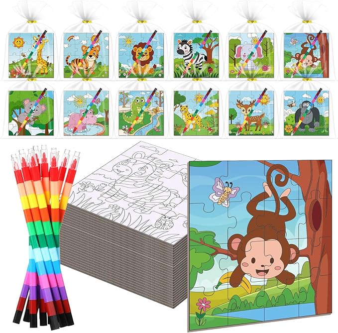 24 Pack Wild Animal Puzzles Jungle Safari Color Your Own Puzzles DIY Wild One Jigsaw Puzzles with 12 Stackable Crayons and 12 Bags for Safari Theme Gifts Birthday Party Supplies