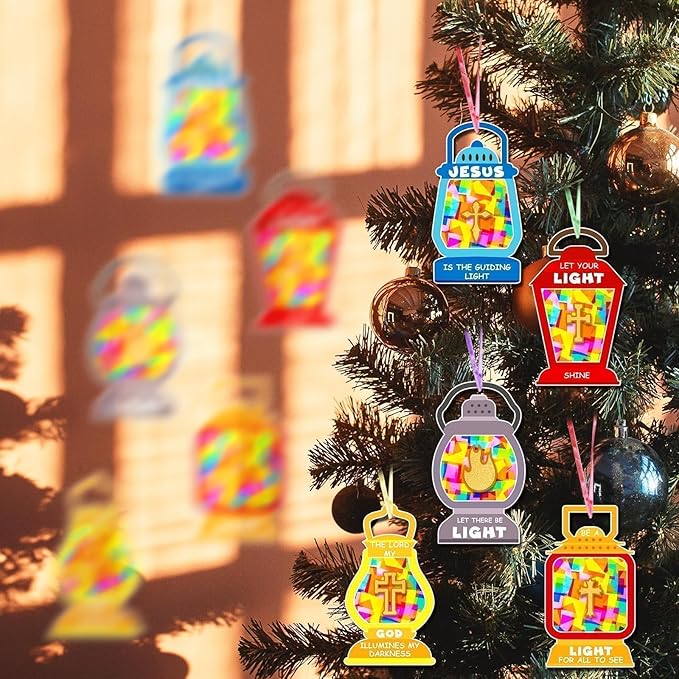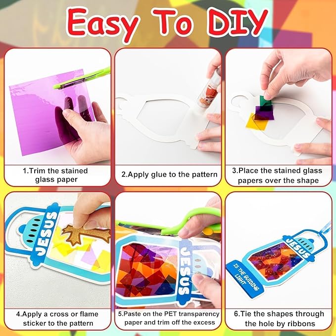 - All-in-One The Guiding Light Suncatchers Craft Kit for Creative Fun:This religious suncatcher craft is a complete set used for creating 9 vibrant religious jesus light shaped suncatchers in 9 unique designs. Including 40 PET transparent sheets, 56 glitter paper sheets in 7 colors, 50 satin ribbons, glue, and scissors. Perfect for fall activities and sunday school,famliy, it is capable of providing hours of fun during the holiday season