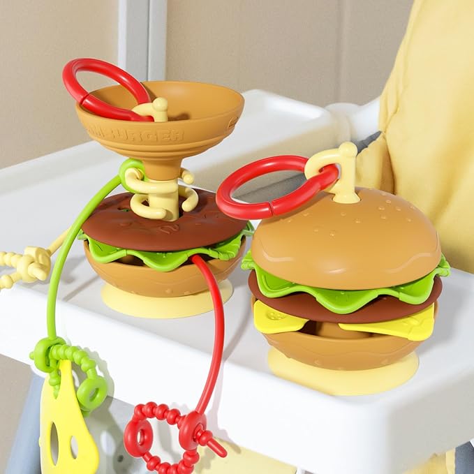 Hamburger Suction Cup Toys Holder for High Chair, Stroller Baby Toys 6-12 Months & Toddlers, 3 Tethers Keep from Falling, Great for Restaurant & Car Seat Airplane Travel