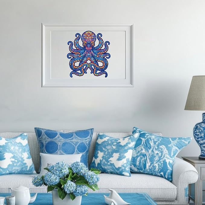 - HOME DECORATION: Turn the completed puzzle into a charming bedroom decoration to enhance your living space. It's not just a jigsaw puzzle, it's a stunning piece of art. Its multi-layered colorful tones and octopus theme, making it perfect for a beach house or any nautical inspired interior.
