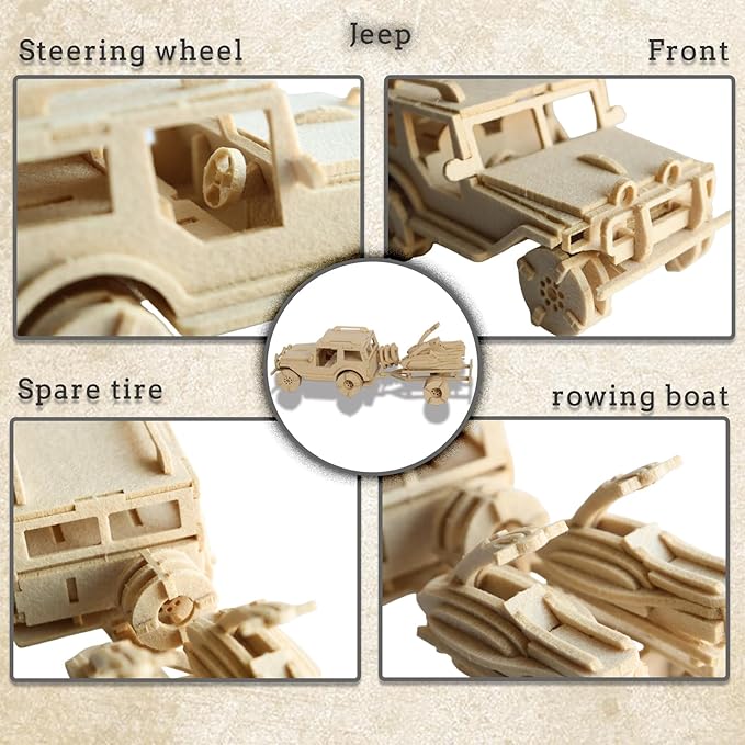 - ๐[Felt 3D Puzzle] Transportation Series - Jeep. โโThis product consists of 126 puzzle pieces. The puzzle measures 11.7*8.3*0.4in, and the completed puzzle measures 9.84 * 3.74 * 2.95in.