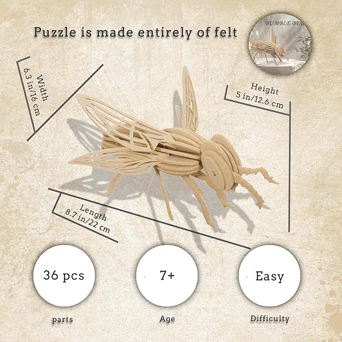 - ๐[Felt 3D Puzzle] Animal Series - Bumblebee . โโThis product consists of 36 puzzle pieces. The puzzle measures 11.7*8.3*0.24in , and the completed puzzle measures 8.66 * 6.30 * 4.96in.