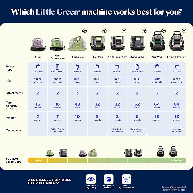 - INCLUDES: 4” Tough Stain Tool with removeable lens, HydroRinse self-cleaning hose tool, and 8oz. BISSELL Little Green Formula.