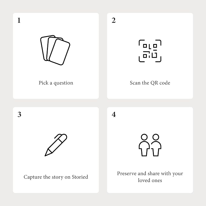 - 78 STORY STARTER CARDS WITH QR CODES – Thoughtfully crafted conversation prompts make it easy to capture life stories from loved ones. Each card includes a QR code for instant digital recording. Perfect for family gatherings, holidays, or one-on-one conversations with grandma, grandpa, mom, or dad.