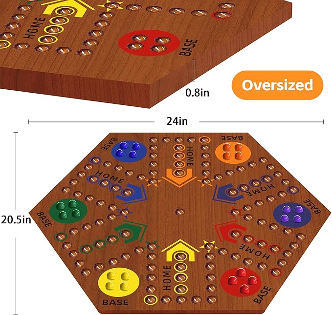 Wooden Board Game, Board Game Original Marble Game Double Sided Painted 2 to 6 Player Fast Track Wooden with 6 Colors 24 Marbles 6 Dice for Adults Kids Family(24 INCH Flame)